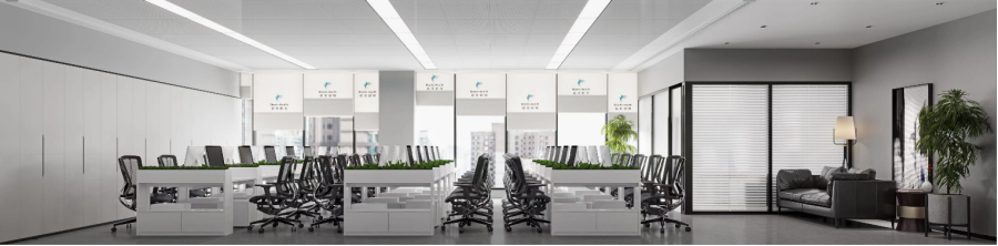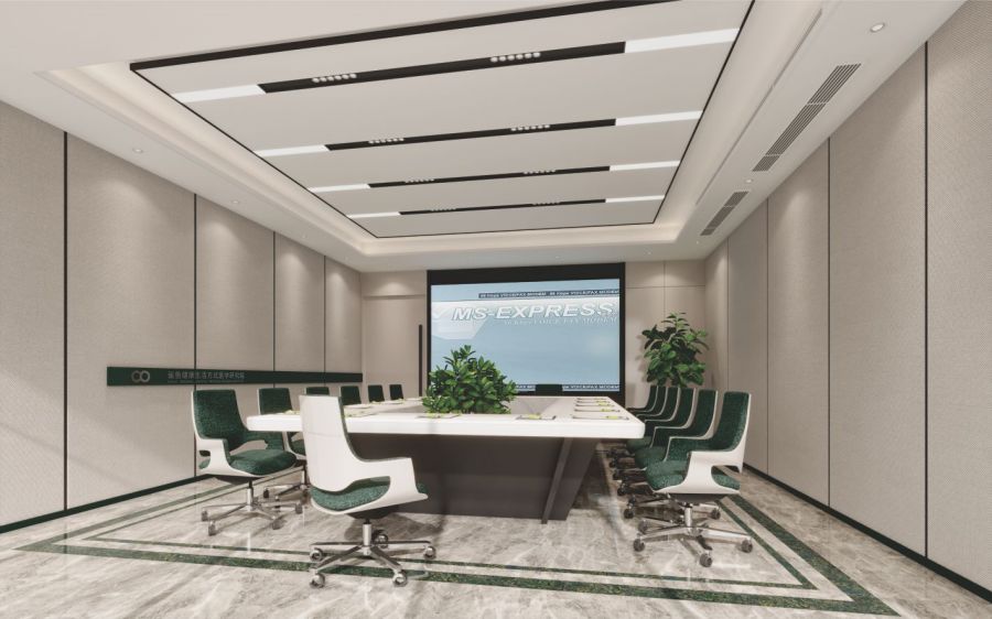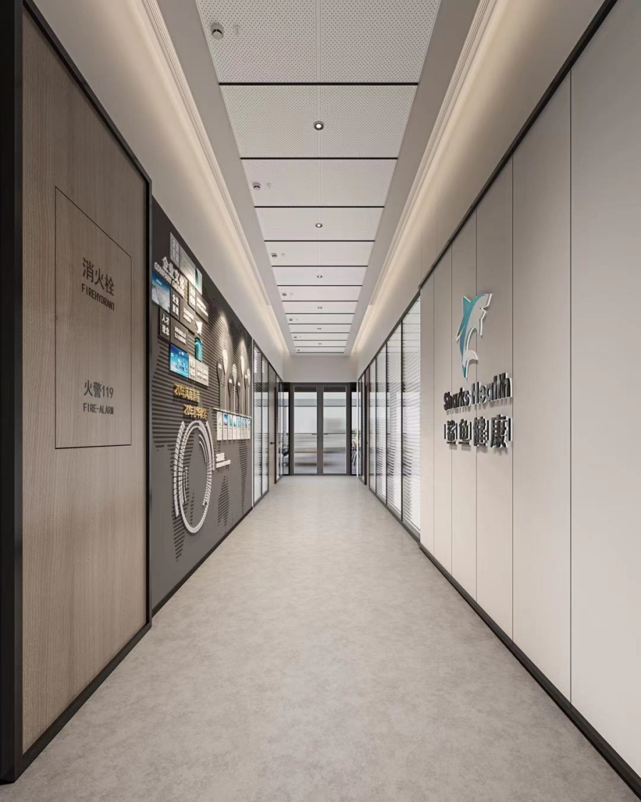綠色是健康色,也是鯊魚健康的企業色,于是我們把綠色融入到了整個設計中,搭配大面積暖色調的米白色,首先從色彩上去提升視覺的舒適度。再結合企業的各個功能需求,每個環節先后的順序,參觀動線去做整個平面空間布局。