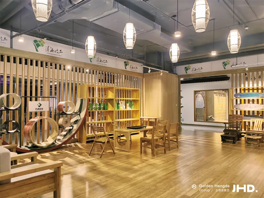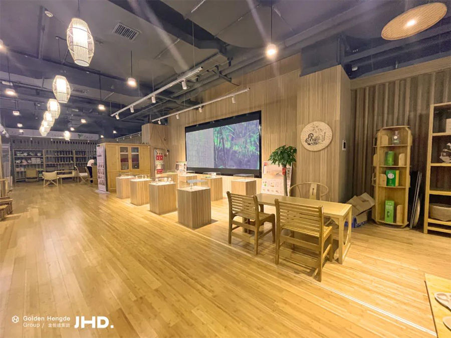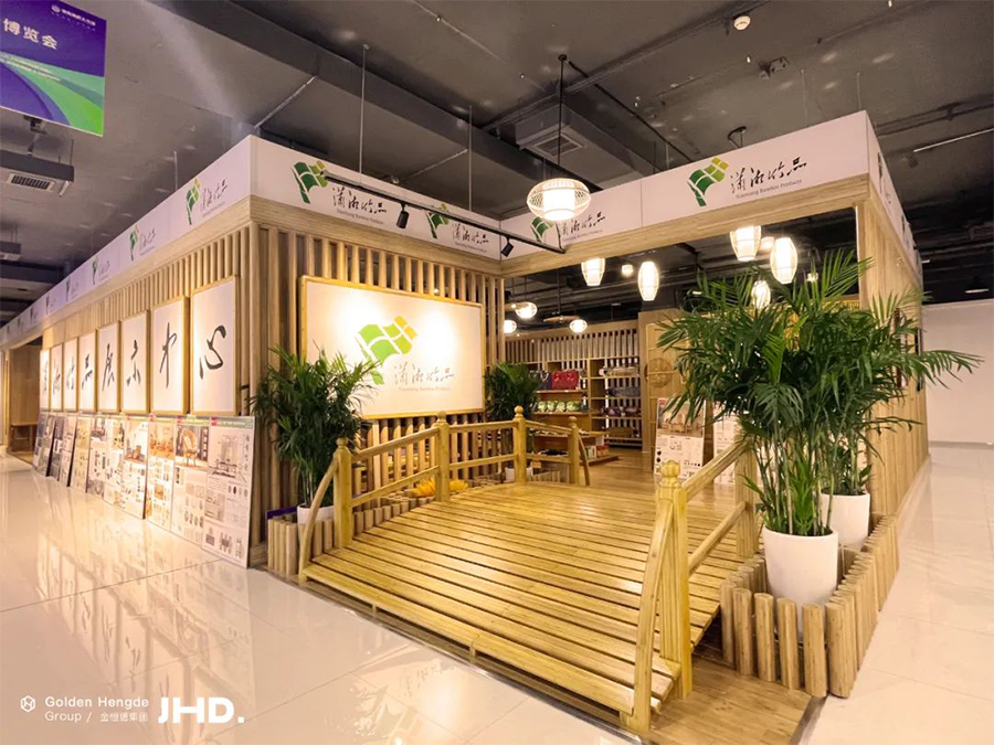 “近年來,資源豐富且綠色環保的竹材料有望替代木、塑料等成為新型的綠色加工原料。以竹代鋼的代表產品有下水管道,高速公路攔網鋼柱;以竹代木的代表產品有竹家具、竹紙;以竹代糧的代表產品有竹筍、竹酒;以竹代塑的代表產品有一次性餐具、竹纖維服裝、下水管道等。本項目使用的裝飾材料及展品基本由”竹元素”材料制作,重點展示了竹元素的可塑性及推廣必要。