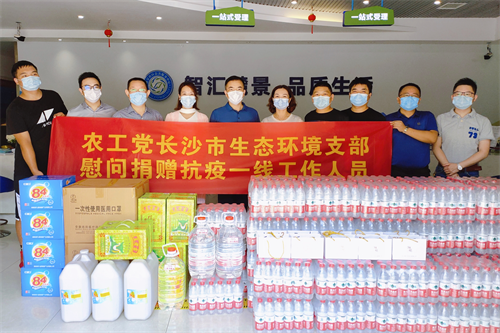 2021年8月6日,在農工黨岳麓區(qū)工委主委劉軍亮帶領下、委員許加漾(圖中左二)等人前往麓景社區(qū),向持續(xù)奮戰(zhàn)在一線的社區(qū)工作人員捐贈礦泉水54箱、王老吉10箱、醫(yī)用口罩4000個、酒精30斤、桶裝84消毒液120斤、湘9星84消毒液4箱,感謝前線人員對岳麓區(qū)和全市防疫工作的辛苦付出。