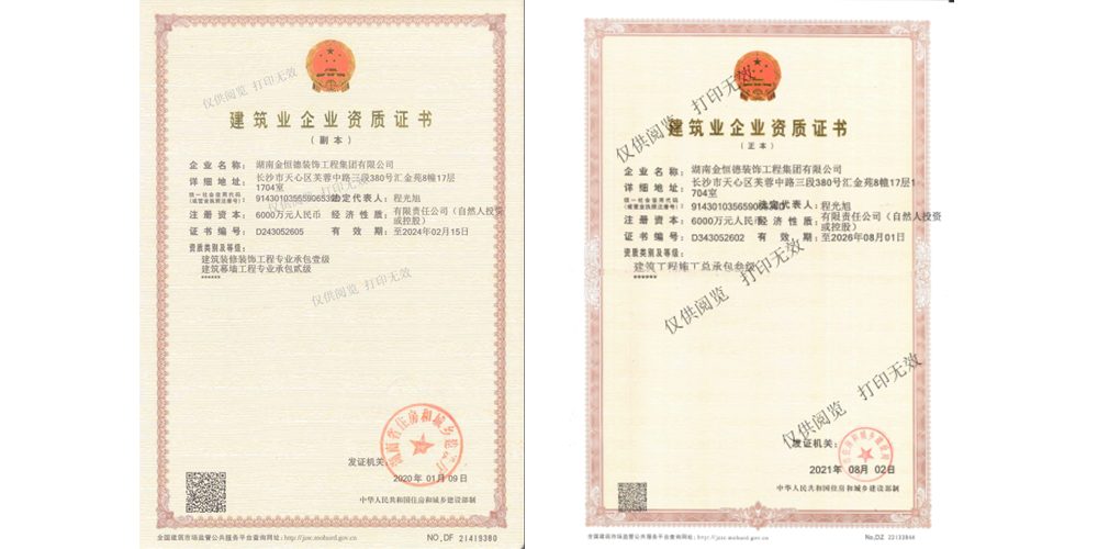 2021年8月份,金恒德集團順利取得建筑工程施工總承包叁級資質。這是公司繼擁有建筑裝修裝飾工程專業(yè)承包壹級、建筑幕墻工程專業(yè)承包貳級、建筑裝飾工程設計專項乙等資質之后的又一個里程碑式資質,標志著金恒德集團的業(yè)務承接能力又邁上了一個新的臺階,為實現企業(yè)又好又快發(fā)展增添一個新的引擎。