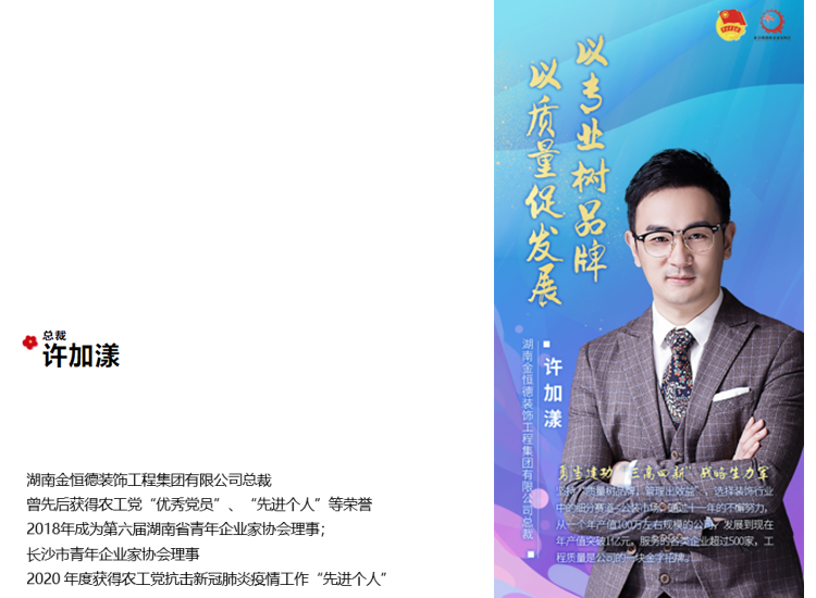 2009年還在武漢科技大學讀大三的許加漾,因為一次偶然的機會進入了建筑裝飾業(yè),大學最后兩年基本上是一半時間在學校修完大學功課,一半時間在企業(yè)跑業(yè)務;從最基層的業(yè)務員做起,頂著烈日寒風,穿梭于武漢的各個CBD寫字樓及工業(yè)園區(qū)之間,兩年的基層工作鍛煉了他堅強的意志力,奠定了他想要更上一個階段的決心。2010年下旬許加漾回到家鄉(xiāng)湖南在長沙正式成立湖南金恒德裝飾工程集團有限公司,雖是公司總裁但他更是公司最大的業(yè)務員,身體力行抓公司市場業(yè)務開拓工作。