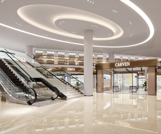 2、空間與色彩的搭配:空間色彩的組合與搭配,直接關(guān)系到商場(chǎng)空間的展示效果。具體選擇哪種色調(diào),當(dāng)然還是保持和諧,互補(bǔ)之勢(shì)為好。