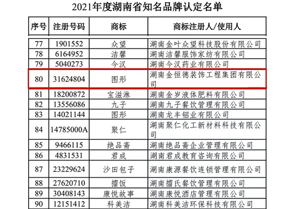由湖南省商標(biāo)品牌協(xié)會(huì)舉辦的知名品牌評(píng)選活動(dòng)于2022年1月28日落下帷幕。通過企業(yè)申報(bào)、專家復(fù)審等環(huán)節(jié),湖南省商標(biāo)品牌協(xié)會(huì)發(fā)布了2021年度湖南省知名品牌認(rèn)定名單,金恒德集團(tuán)獲此殊榮。