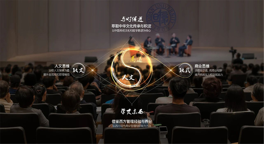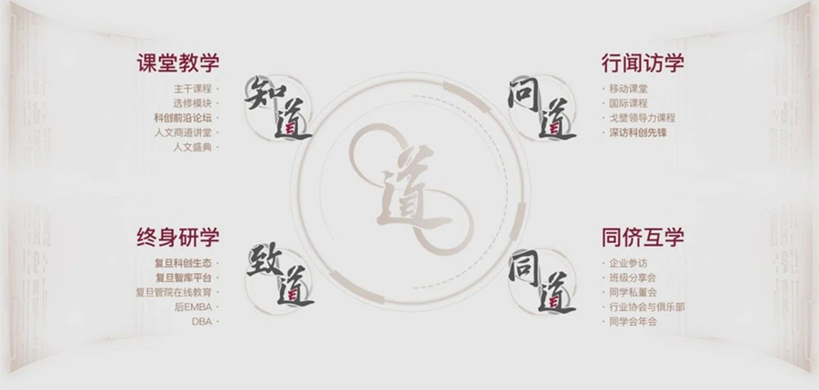 文商道的課程體系分為人、文、商、道四大模塊,涵蓋了將帥之才所必須的具備的個人能力,文化通識,商業之術及致勝之道。融會貫通的學程體系分為知道、問道、同道、致道四大模塊。